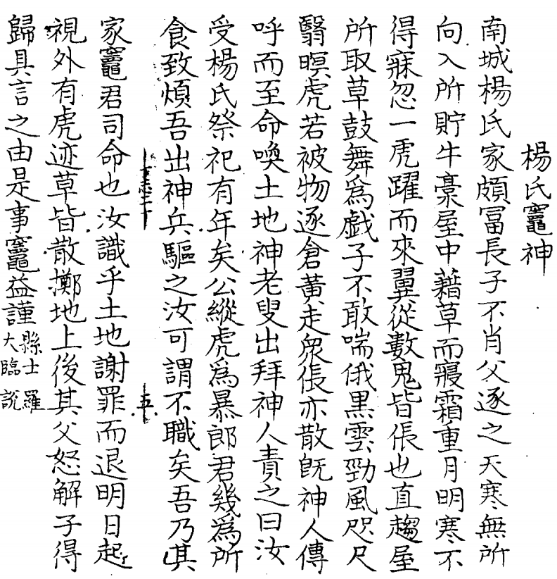 宋代洪迈编《夷坚丁志》卷二十《杨氏灶神》条说,有一家姓杨,特别有钱。有一年冬天,杨家爸爸和儿子吵架,儿子小杨被赶出家门,只好跑到存干草的库房里过夜。库房没暖气,儿子冷得睡不着,正躺着哆嗦呢,库房里突然钻来一头大老虎,后面还跟着几个伥鬼。